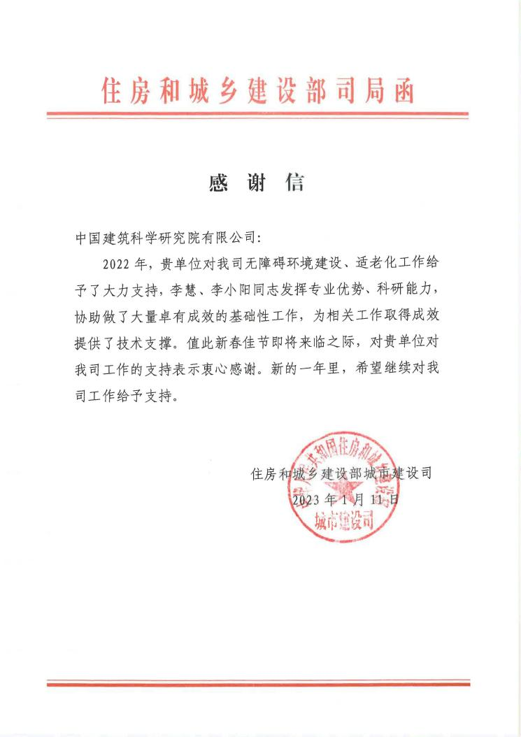 春節(jié)前夕,中國(guó)建研院收到住房和城鄉(xiāng)建設(shè)部城市建設(shè)司發(fā)來(lái)的感謝信,對(duì)中國(guó)建研院在無(wú)障礙環(huán)境建設(shè)、適老化工作給予的大力支持,及有關(guān)同志發(fā)揮專(zhuān)業(yè)優(yōu)勢(shì)、科研能力和取得的成效上給予肯定并表示感謝,同時(shí)希望新的一年里對(duì)住建部城建司工作繼續(xù)給予支持。