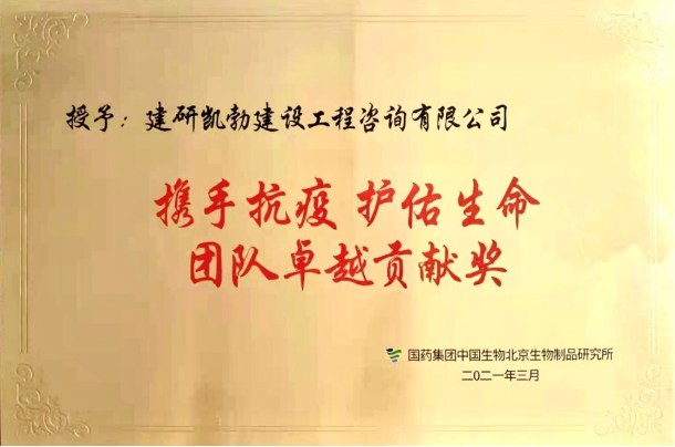 3月27日,集團(tuán)公司下屬子公司建研凱勃建設(shè)工程咨詢有限公司(以下簡稱“建研凱勃”)榮獲國藥集團(tuán)中國生物北京生物制品研究所頒發(fā)的“攜手抗疫護(hù)佑生命”團(tuán)隊(duì)卓越貢獻(xiàn)獎(jiǎng)。