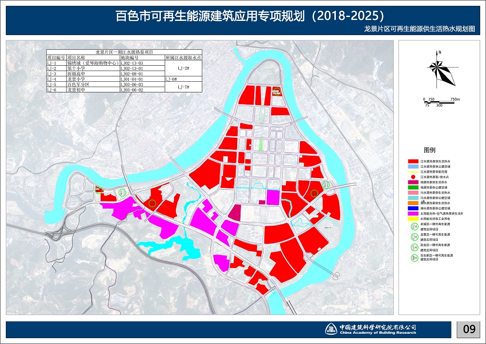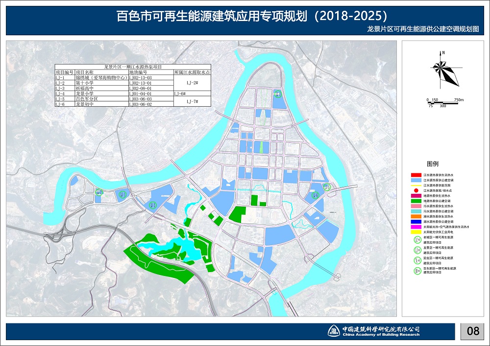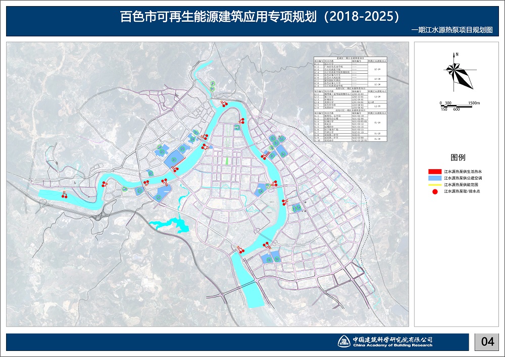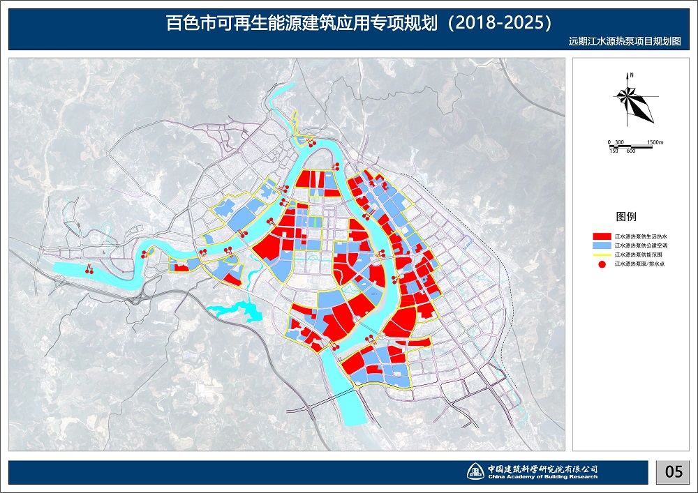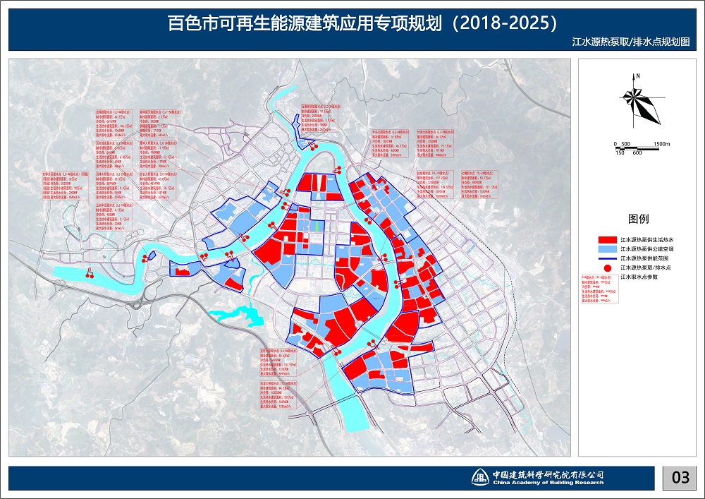 本規(guī)劃大規(guī)模應(yīng)用江水源熱泵。劃針對百色市獨特的豐富水源——右江水系,專門制作江水源熱泵規(guī)劃專篇,研究江水源熱泵效率的各影響因子,以取排水點互不干擾為原則,科學(xué)排布取排水點。并根據(jù)建筑物布置確定江水源熱泵站點位置。
