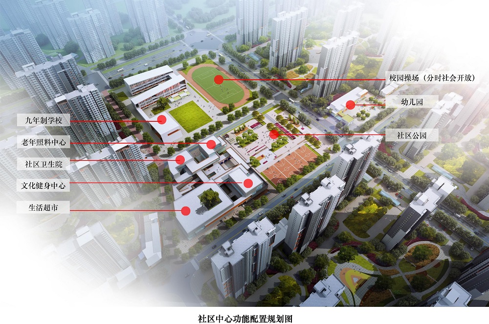 將生活超市、文化娛樂、全民健身、社區(qū)醫(yī)療、老年照料、九年制學校、社區(qū)公園、幼兒園和管理服務(wù)等社區(qū)類級的公共設(shè)施相對集中或鄰近布局,實現(xiàn)了便利化使用和規(guī)?;?jīng)營的雙重目標。規(guī)劃同時兼顧設(shè)施抗擾和共享平衡的問題:醫(yī)療、養(yǎng)老相互結(jié)合,教學設(shè)施相對獨立,學校操場臨近社區(qū)公園和文體中心布置,方便對外開放和聯(lián)動使用。