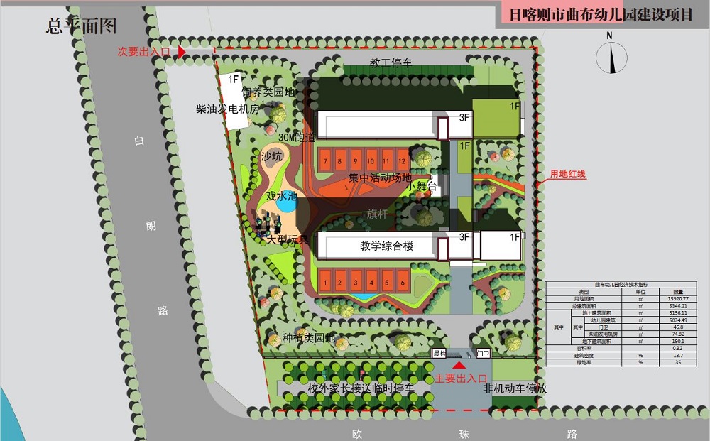 ????本項(xiàng)目位于日喀則珠峰開(kāi)發(fā)開(kāi)放試驗(yàn)區(qū)教育城內(nèi),規(guī)劃為12班幼兒園,建設(shè)用地為15920.77㎡,建筑總面積為5346.21㎡,其中地上建筑面積為5156.11㎡,地下建筑面積為190.1㎡。項(xiàng)目用地南側(cè)為規(guī)劃道路,西側(cè)為綠化用地和規(guī)劃道路,東側(cè)和北側(cè)分別為規(guī)劃桑珠孜區(qū)第四小學(xué)和規(guī)劃園丁苑。