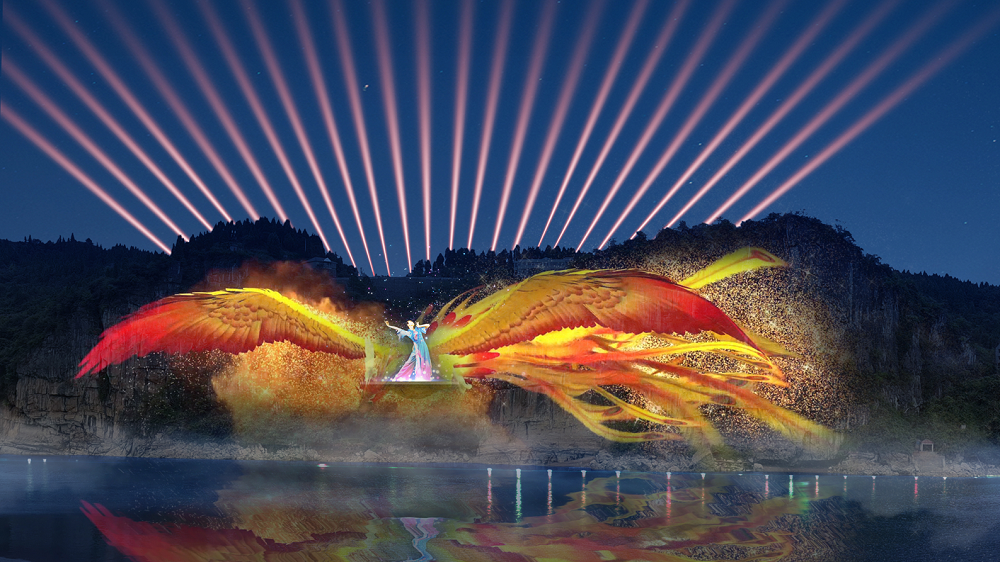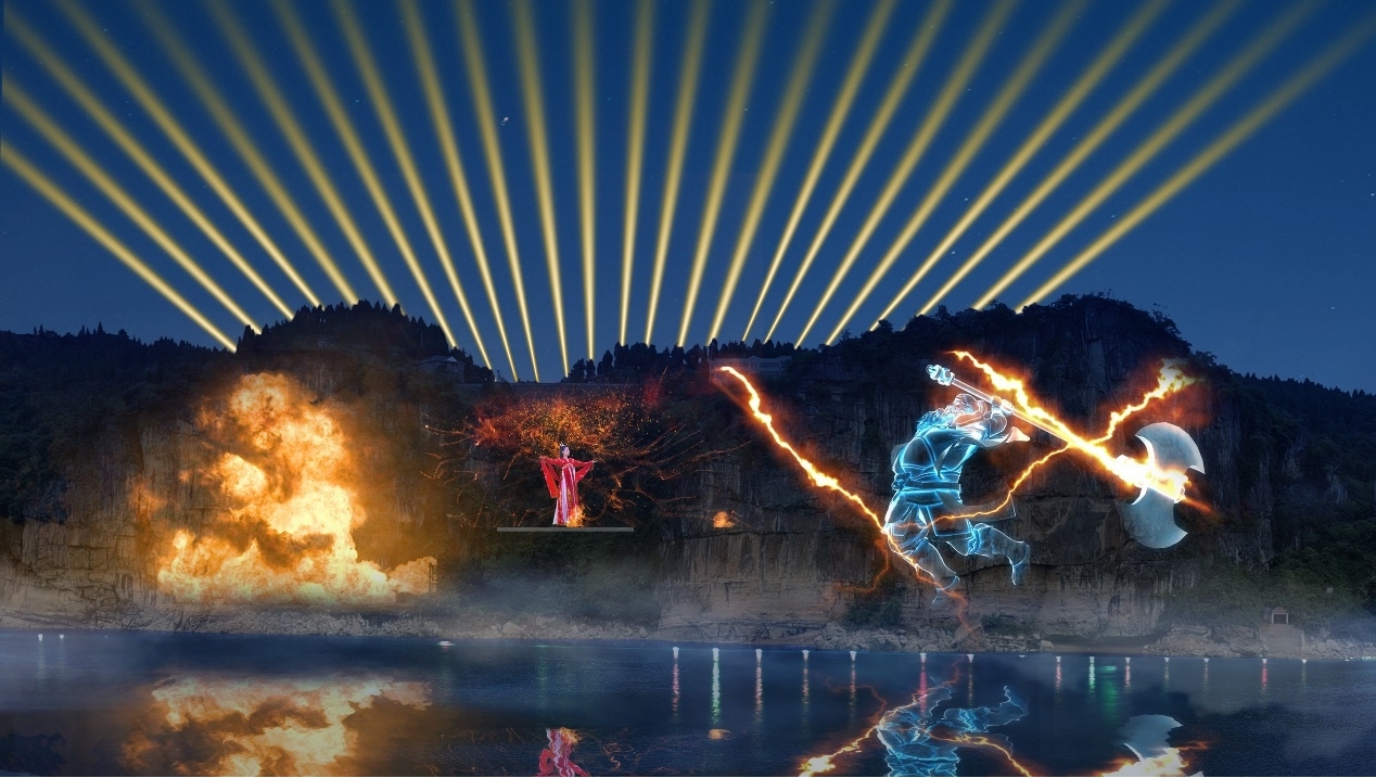 崖壁5D燈光秀尤為新穎,采用“崖壁投影+舞臺(tái)演繹”的方式,以兩側(cè)崖壁為投影載體,中間布置小舞臺(tái)配合燈光矩陣,將辛女與盤瓠的凄美愛情故事和妖怪來襲國(guó)破山河場(chǎng)面,將軍點(diǎn)兵出征的戲劇場(chǎng)面演繹得活靈活現(xiàn)。