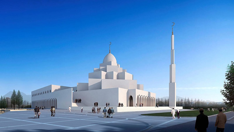 與禮拜殿相連的雙層環(huán)廊設計,通過一系列的拱形門柱,將庭院緊密環(huán)抱。門柱的拱形在延續(xù)13-15世紀建筑風格的基礎上,又加以了創(chuàng)新,門拱如扭曲的柳葉,形成自然曲面,朝向庭院。潔白的環(huán)廊與麻石地面,所構成的機理對比,給人以莊嚴、樸實的印象。37m高的宣禮塔同樣采用運用了同構原理,將鋼結構三棱柱體以幾何關系層層遞減,塔頂?shù)膶毱亢驮卵佬窝b飾物,與禮拜殿穹頂上的標志遙相呼應,構成伊斯蘭教"彎月涵星"象征。