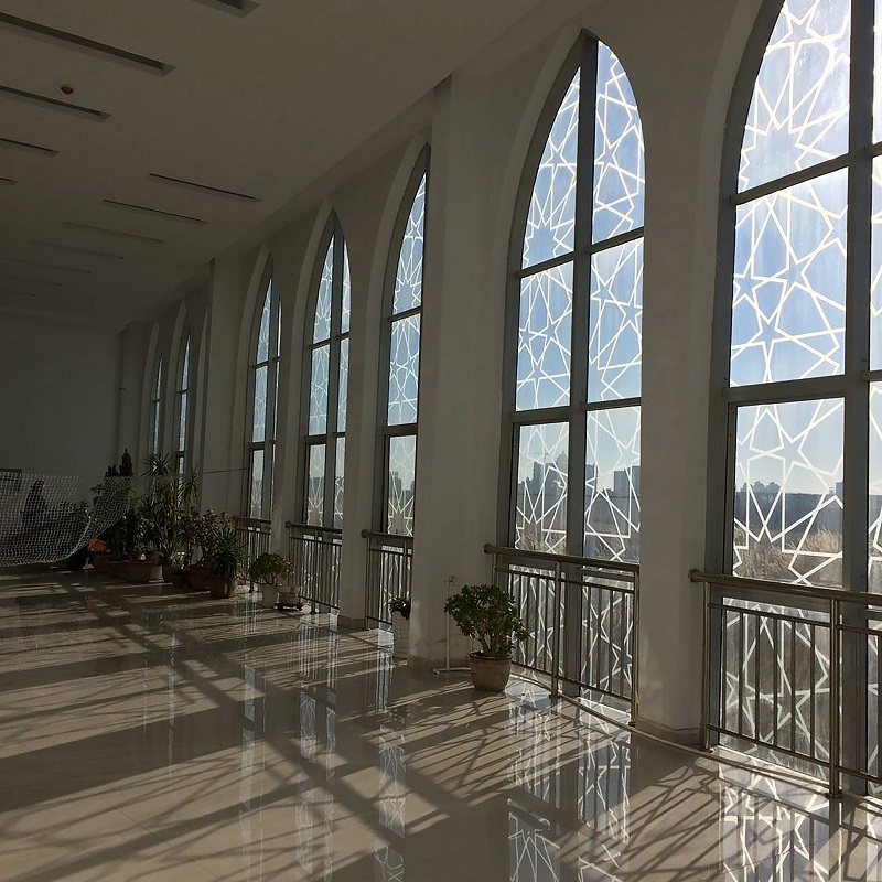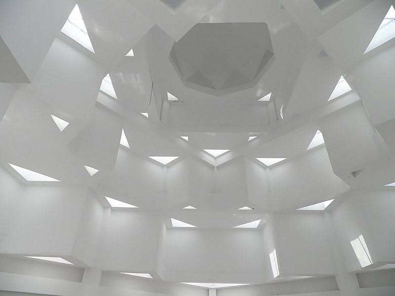 沿西北角三段式大臺階而上,可到達清真寺最重要部分的禮拜殿,也是建筑設計的“點睛”之筆:禮拜殿和穹頂?shù)脑O計,運用了同構原理,將伊斯蘭紋樣進行分解、變化后,生成新的幾何形體,每一層退臺與建筑形體旋轉(zhuǎn)相結合,產(chǎn)生更多、更豐富的三角形平面組合,利用這些組合,為禮拜殿上空設計了“逐層退臺”的三角形采光窗。給禮拜殿帶來了豐富的自然光源。同時,一天內(nèi)的光束變化,也將人引向一個深邃的、神圣的、崇高的精神空間。
