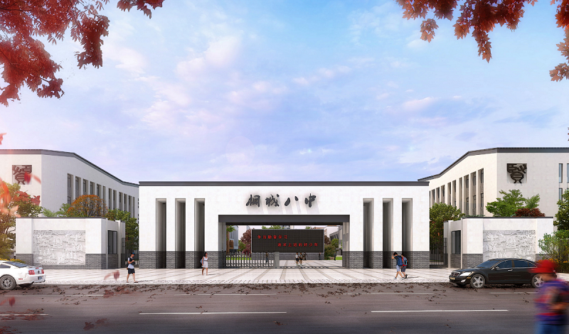 建筑理念——校園的歷史原型:“辟雍”體現(xiàn)了“天圓地方”的中國傳統(tǒng)宇宙觀。整個校園立面材質(zhì)以黑、白、灰為基調(diào),取徽派建筑之精華、融合現(xiàn)代建筑設計手法,脫離于傳統(tǒng),不失其韻味。中心造型力求現(xiàn)代、空靈、內(nèi)蘊,輪廓線平緩、舒展,塑造出桐城市第八中學的現(xiàn)代風貌。布局上,中心雕塑作為整體校園的核心,圍繞中心雕塑設置行政綜合樓、高一、高二教學實驗樓和高三教學樓。