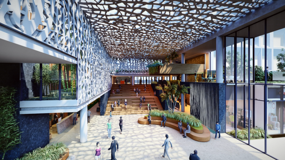 針對項目的所處區(qū)域環(huán)境、既有建筑群空間與土建現(xiàn)狀等現(xiàn)實(shí)挑戰(zhàn),規(guī)劃設(shè)計提出打造集住宿、工作、社交、休閑于一體的商務(wù)生態(tài)閉環(huán)策略。通過連通首層商業(yè)東線、塑造小鎮(zhèn)中心、加建空中連廊、改建局部空間等方式,將首層商業(yè)社區(qū)、二層酒店社區(qū)與上層商務(wù)辦公社區(qū)多業(yè)態(tài)由平面復(fù)合街區(qū)轉(zhuǎn)向?yàn)榱Ⅲw復(fù)合街區(qū),以構(gòu)建更具溫度感的生活情景,加強(qiáng)侵入式的極致體驗(yàn),提升服務(wù)資源的共享品質(zhì),創(chuàng)造多樣化的空間視點(diǎn),引發(fā)不同視角下對生活的獨(dú)特感悟。